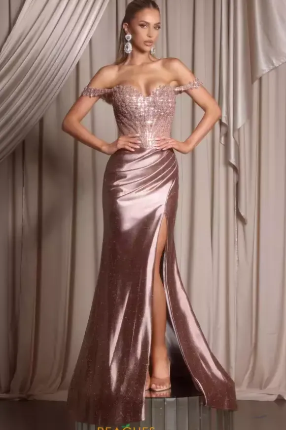 Shine brightly at your next social occasion in this sparkling Portia And Scarlett long dress style PS26334E. This glistening gown showcases an illusion corset bodice embellished with beading with off the shoulder cap sleeves and sweetheart neckline. The long slim skirt is lame satin with ruching, front, side slit and back sweep train.