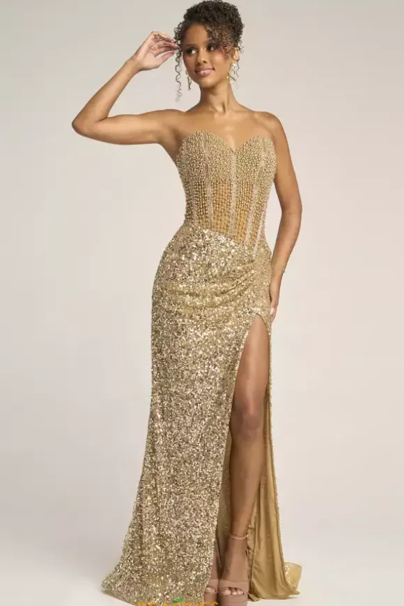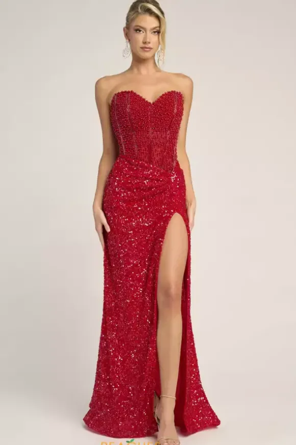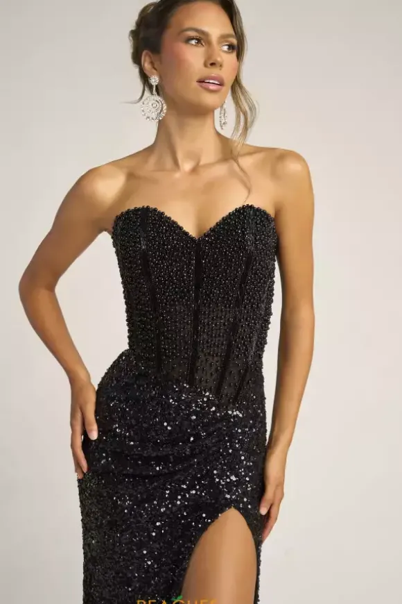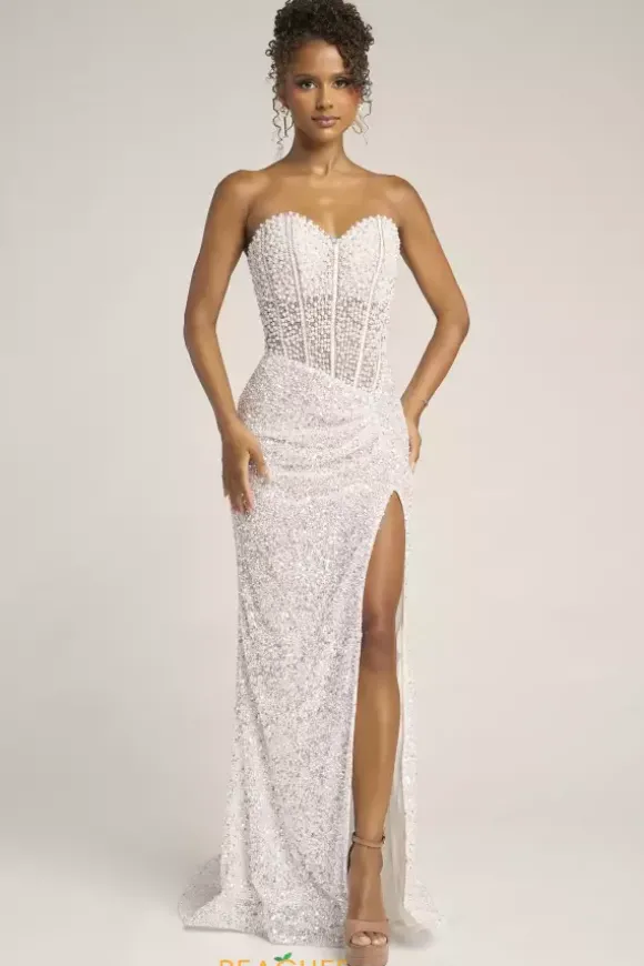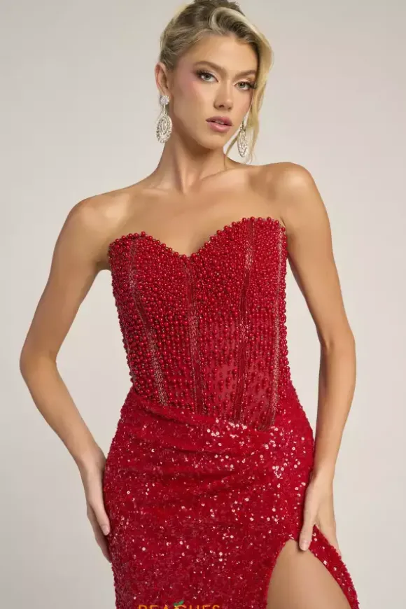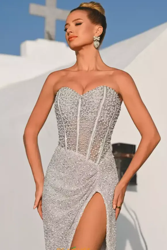 Look red carpet ready in this scintillating Portia and Scarlett long dress style PS26432C embellished with pearls, beads and sequins. This impeccable gown features an illusion, strapless corset with a sweetheart neckline, exposed boning and low back with zipper closure. The long, slim skirt has ruching to one side and high, front, side slit.