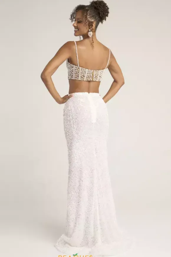 We just love this one of a kind two piece dress from Portia and Scarlett style PS26453C. The white and nude combination on this crop style bodice has a sweetheart neckline and thin shoulder straps. Adorn with pearl and rhinestone beading, the bodice stands out. The fitted long skirt is sequins from top to bottom.