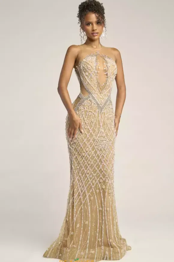 Have a vintage inspired moment in this gorgeous Portia and Scarlett long dress style PS26454C. Available only in this rich nude and silver combo, this high neckline dress made from sheer illusion to give you the look of wearing just bead work. The intricate beading is made of up pearls, rhinestones and sequins.