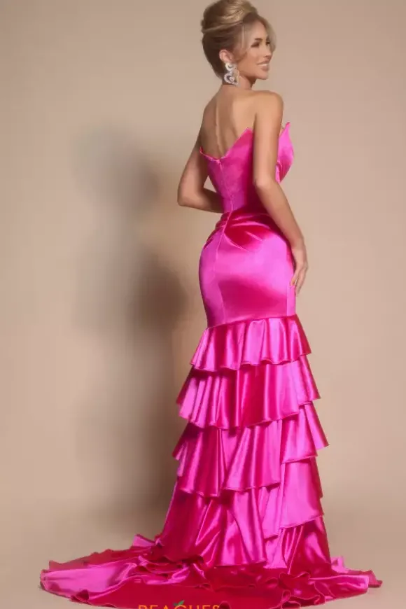 Be the drama in this head turning Portia and Scarlett satin prom dress style XO021. Glamorous from top to bottom, this strapless fitted silhouette displays pleating on the front of the fitted skirt above the frilly multi tiered cascading sweep train. Strut easily with a daring thigh high slit and glowy sweep train.