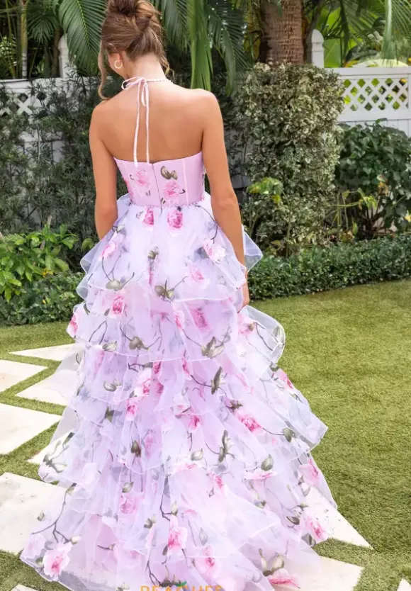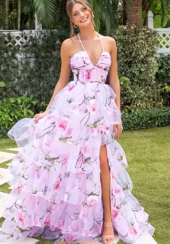 We are just in love with this printed Portia and Scarlett a line dress style XO176. Available only in this pink floral print, this halter v neckline dress has these thin beaded straps that tie behind your neck. The printed chiffon material dress has a structured bodice with a flounce a line tiered layered skirt.