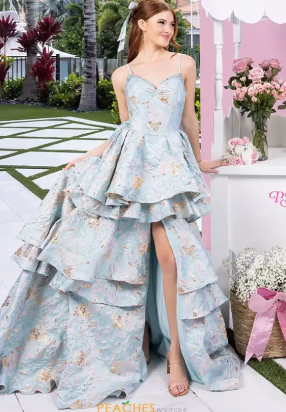 Be the envy of all when you wear this trendsetting Portia and Scarlett textured prom dress style XO181. Subtle beadwork traces the v neckline for radiance while the printed brocade fabric exudes a sleek shine all the way down to the extra long statement sweep train. The peek a boo thigh high slit completes this look.