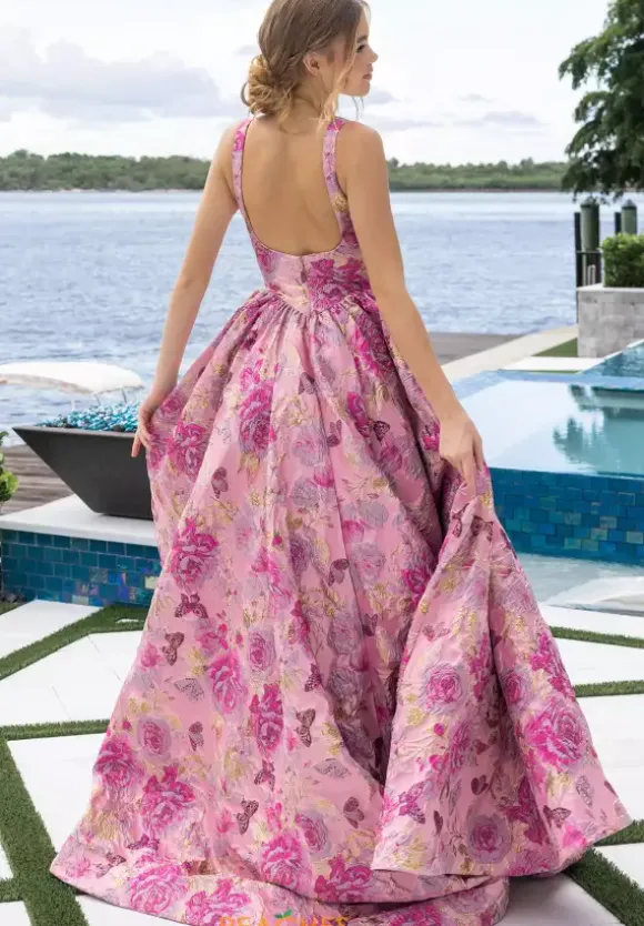 Be regal and elegant in this lovely Portia and Scarlett prom a line dress style XO188. Available only in this novelty brocaded material, this scoop neckline has thick shoulder straps and a drop waist line. The a line skirt falls perfectly from the waist. The lovely skirt has these shades of pink flowers with gold accents.
