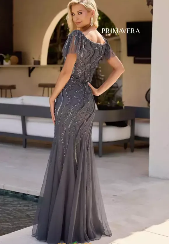 This gorgeous long dress by Primavera style 13155 exudes elegance. Featuring subtle amount of beading that adds a delicate amount of shimmer without being too overpowering and still giving you a beautiful shimmer. A formal cap sleeve offers a flattering and modest look, adding the perfect amount of elegance as well as coverage.