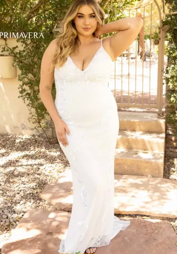 Have all eyes on you when wearing this extravagant dress 14005 by Primavera. Showcasing a modest v neckline with fully beaded straps, this stylish fitted dress is a must have. Entirely garnished with dazzling sequins, the lavish ensemble is also decorated with eye catching beadwork that cascades down the dress.
