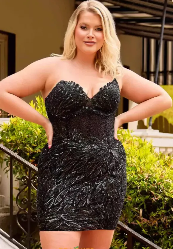 Own the room at your next special event in this short fitted dress by Primavera, style 14091. This body con silhouette features a strapless V neckline with fitted corset that hugs your waist perfectly. This dress is beautifully detailed in glistening beadwork, making you shine at every angle. Back zipper for an easy and secure fit.