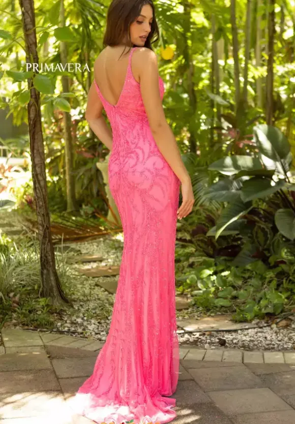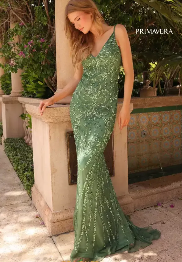 Set the trend in classy style 3793 by Primavera. This fitted silhouette is fully adorned in ornate beaded patterns that have been sewn to perfection to give you fascinating detail with radiant shine. The V neckline is supported by dainty straps that merge int a scoop open back. This dress is completed with a classic sweep train.