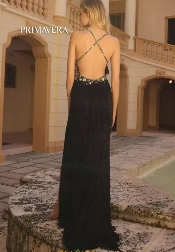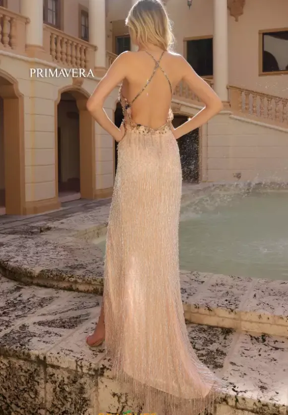 Stun the crowd in incredible Primavera style 4145, showcasing a vibrant, playful bodice embellished in charming floral beading atop transparent material. The V neckline has cute beaded straps that gracefully cross along the open back style. The stunning skirt is covered in dramatic fringe beading that swings with each step, complete with a slit and train.