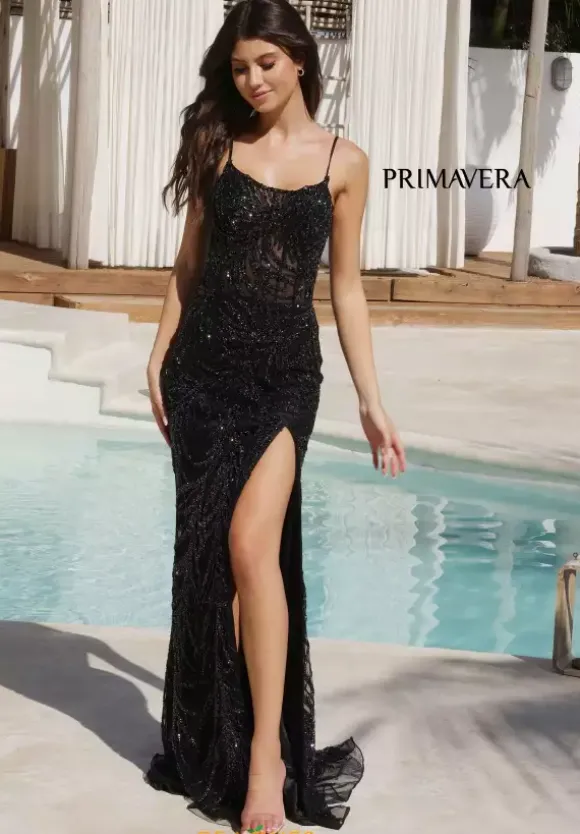 Captivate the crowd when wearing this ravishing long fitted dress by Primavera, style 4310. Featuring a scoop neckline with dainty straps that cascades in a gorgeous corset lace up. Show off your lengthy legs with the slit, while the train flows beautifully behind you. Adorned is lovely beadwork, this dress will for sure make you the talk if the night.