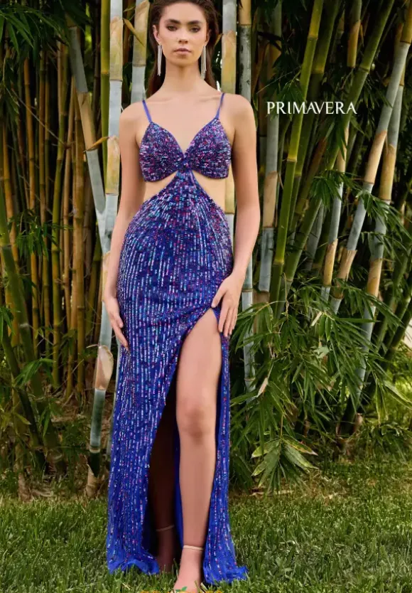Have eyes on you all night when you wear this jaw dropping long fitted dress by Primavera, style 4370. Glistening and shimmering, this dress is adorned in stunning beadwork that will have you shine all night long. Featuring a striking V neckline and side cut outs that leads into a sexy open back. The slit allows you to strike a pose while the dramatic train cascades behind you.