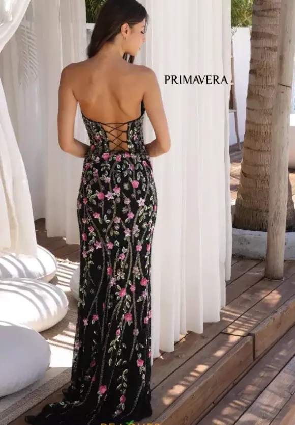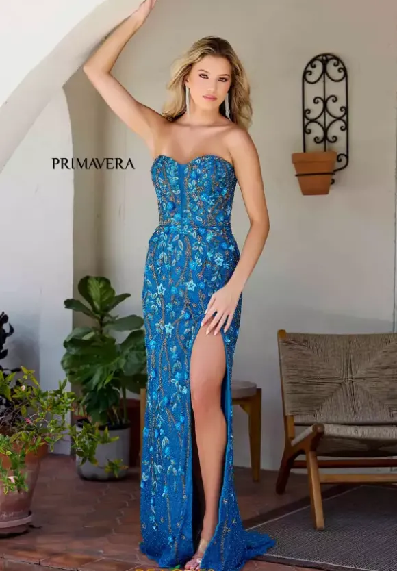 Unveil your charm when you choose to purchase this dress by Primavera style 4380. This fitted dress features a strapless scoop neckline with a mesh panel down the middle. The back displays a corset lace up to support and accentuate your figure. The thigh high slit is paired with the sweep train. The beading and sequins is formed in floral patterns, decorating the entire dress.