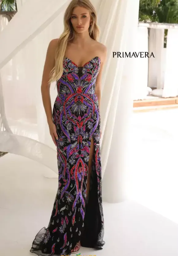 This exquisite strapless dress by Primavera 4387 with a sweetheart neckline is a true vision of elegance and glamor. The entire gown is fully adorned with intricate beadwork, creating a dazzling, sparkling effect that catches the light with every movement. An open lace up corset design ensures a customizable, figure flattering fit.