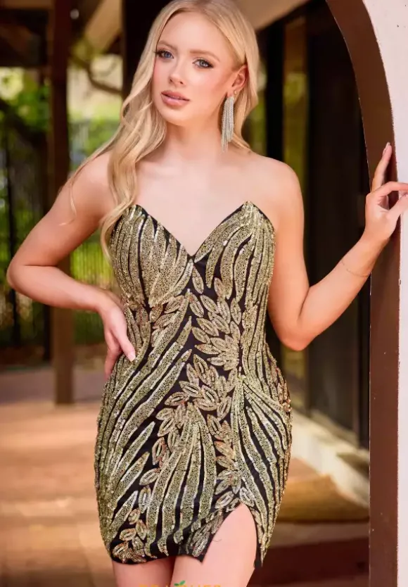 Look ready to attend the red carpet in this fun and chic short dress by Primavera style 4426. Featuring a strapless v cut neckline and a full zipper back. This flattering dress is made with a unique sequins pattern adding the perfect amount of glam and drama. You will leave an everlasting impression.