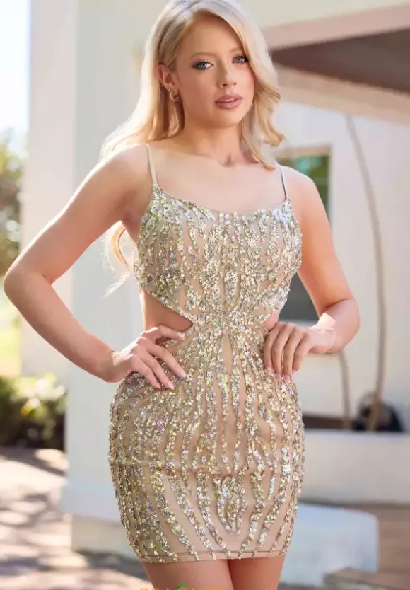 Make this years trend setting statement in unique short style 4481 by Primavera. Showcasing the scoop neckline and enticing side cut outs which fall into the tasteful open back enclosed with a single clasp decorating. Shimmering beading which lays skillfully placed all over the fitted silhouette to leave you illuminating.