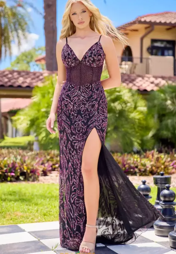 Have a wicked entrance in show stopping long style 4506 by Primavera. .The flattering v neckline is paired with an illusion bodice generously detailed with glistening beadwork. Headlining the fitted skirt intricately embellished with matching beadwork to compliment yet elegantly have you gleaming effortlessly all night.