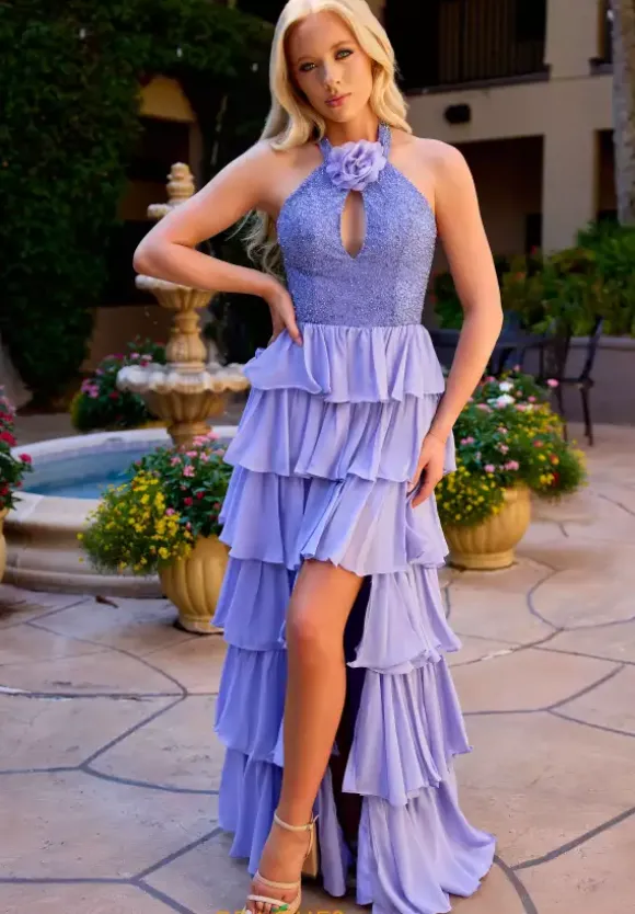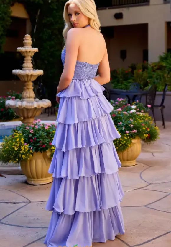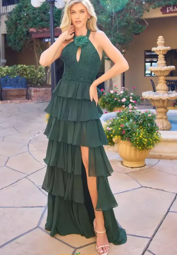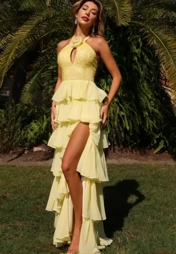 Leave everyone jaw dropped when you wear this one of a kind long A line dress by Primavera style 4530. This unique dress features a high halter neckline that cascades into a back zipper. This dress is made with chiffon material and decorated with beadwork and sequins as well as a ruffle skirt with a slit that will complete the look.