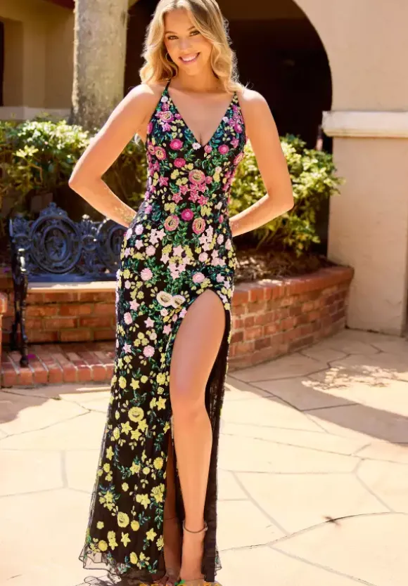 Have all eyes on you wearing Primavera long style 4547. This striking fitted dress showcases a classic v neckline paired with simple beaded straps that create an eye catching crisscross open back. The fun pop of bold colors adds the glitz and glam on this stylish dress that will have you looking picture perfect.