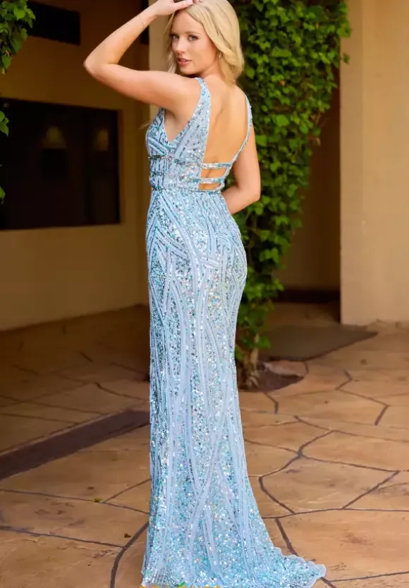 Look and feel your best wearing Primavera long dress 4548. This lovely fitted gown showcases a deep v neckline with thick shoulder straps and semi open back. Unique intricate patterns of dazzling sequins will shimmer and shine with every movement you make ensuring you stand out beautifully all night long.