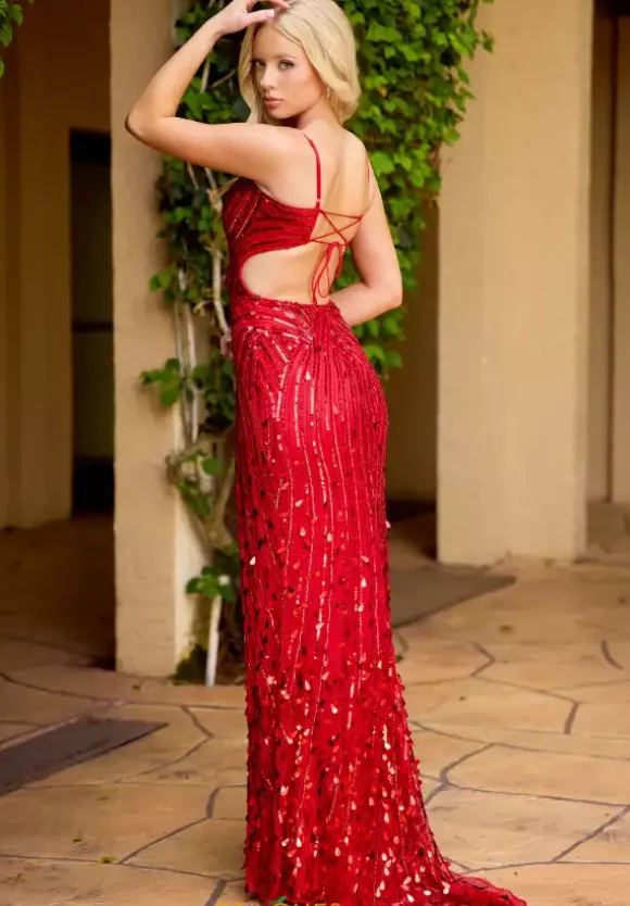 Show stopping long style 4554 by Primavera will have you looking ravishing. The scoop neckline and side cutouts which lead into the alluring open back enclosed half way with a subtle corset lace tie. Rows and rows of figure flattering lines of sequin and a clustered amount of dimensional paillette decorate the entire skirt of the remarkable gown.