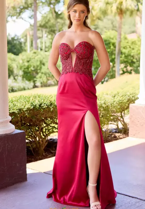 Elegant yet simple is the way to go when you wear this long fitted dress by Primavera 4556. This charming dress features a strapless sweetheart neckline that cascades into a beautiful bodice decorated with beadwork and a skirt made with satin. This dress also has a slit and a train that make the dress more elegant.
