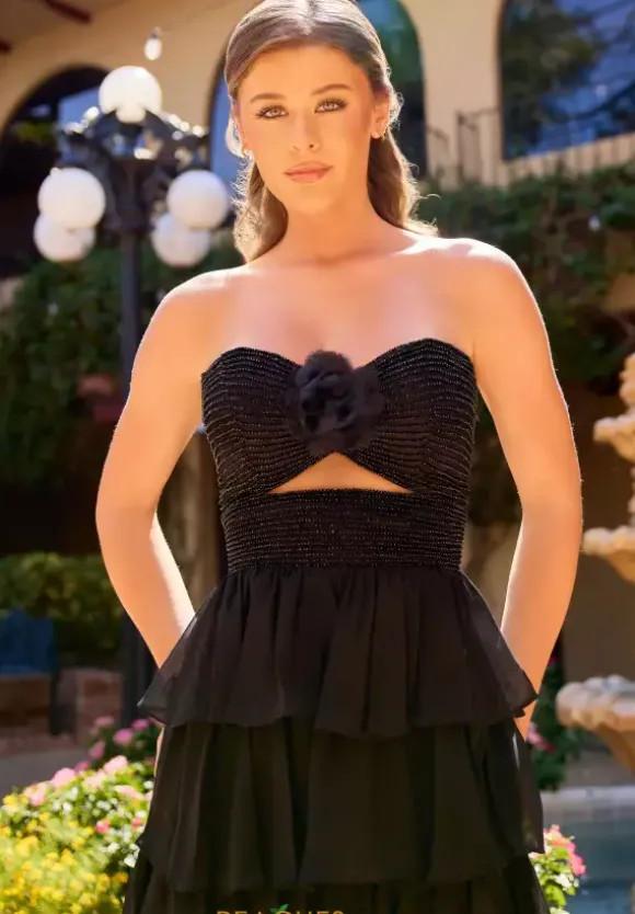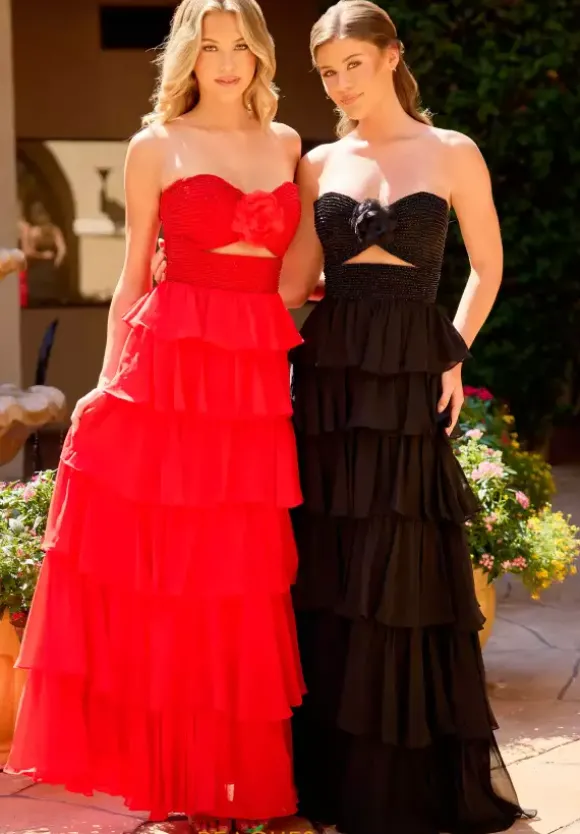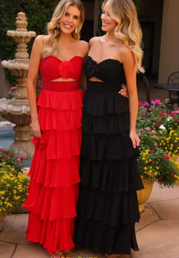Sleek and elegant is the way to go to any special event you attend in this long fitted dress made by Primavera style 4563. This bodice showcases a fabulous strapless scoop neckline that highlights the unique beaded flower right in the center with a keyhole cut out. The entire dress is made out of chiffon material so you can dance comfortably all night.