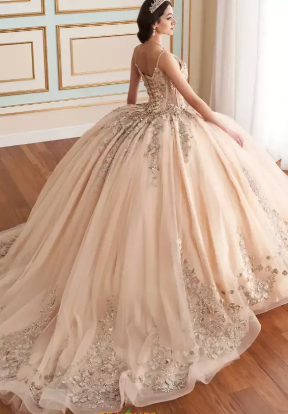 Create wonderful memories with this lovely Princesa dress, style PR30182. This ball gown dress features a graceful V neckline that is adorn in delicate beaded straps. This Princesa dress features a detachable bow and comes with a cape, allowing you to style the dress in various ways. The shimmering sequins on the dress will catch catch everyone’s eye in every picture taken.