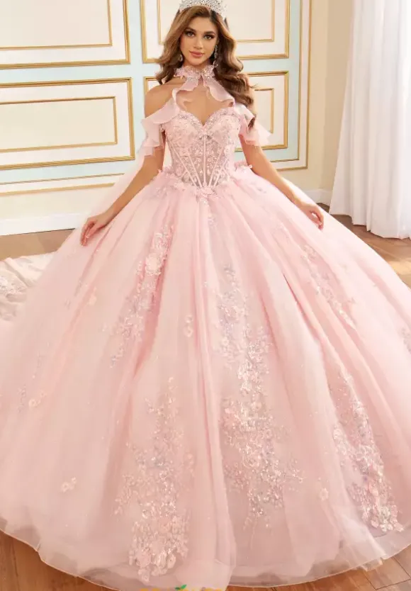 Feel like royalty in this stunning Princesa Quinceanera dress style PR30199. This long waisted bodice can be worn sheer or with a full bodice liner. The strapless neckline comes with separate shoulder straps. The three dimensional rosettes adorn the bodice and the sparkling appliques shimmer throughout the dress. The dress showcases a large detachable bow and detachable long cape. A stunning jewelry neck piece comes with.