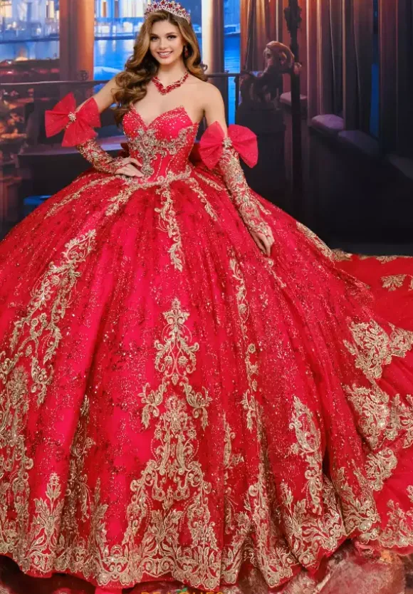 Show up to your Quinceanera in this breathtaking ball gown from Princesa style number PR70104. The strapless v neckline corset bodice has a rhinestone lace up in the back. The dress comes with separate shoulder straps and sleeves. The ball gown skirt is made from a cracked ice glitter tulle with an extravagant long detachable train and detachable bow. The dress includes a capelet.