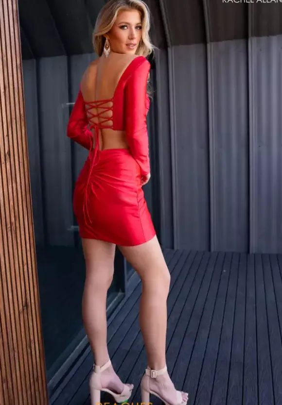 Embrace your fun and wild side in this short fitted dress by Rachel Allen 40421. This unique two piece dress outfit features ruched stretch satin material. The top has a deep v neckline and long sleeves with an open lace up back. The skirt overlapping skirt has a mini slit that will be sure to draw all eyes to you.