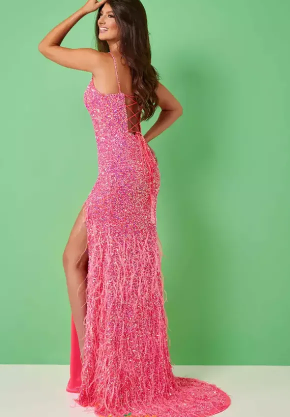 Trend setting style 70150 by Rachel Allan is embellished with hanging fringe bead work. This Rachel Allen style 70150 features a fully beaded silhouette with a scoop neckline. The bottom of this dress flows perfectly into a gorgeous feathery ensemble. The high slit gives the dress a sexy but still classy look. The back of this dress is tied together with beautiful lace up straps.