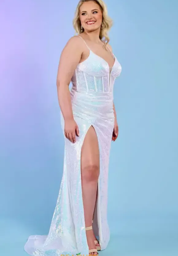 Gown 70307 by Rachel Allen blends class with glam. The overall elegant design of corset boning, a fitted cut, and thin beaded straps truly stand out by the fully adorned sequin beading. The glittery beading is contrasted by a translucent bodice. The back cut of intersecting straps is graceful, and stands out among an otherwise open back.