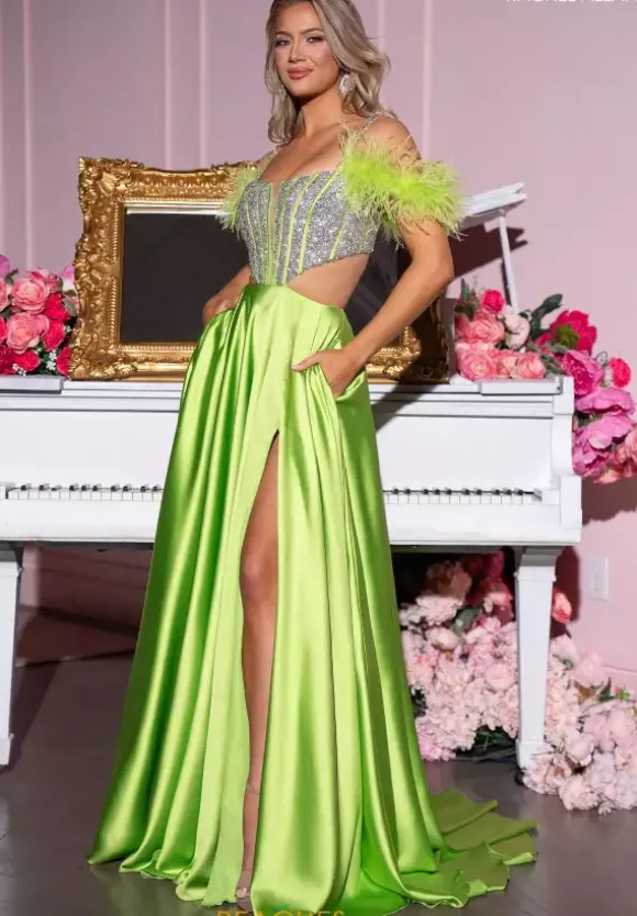Show off your chic sense of style in ornate Rachel Allen style 70519, displaying a gorgeous fitted bodice adorned in glistening beading and featuring flattering side cut outs. Corset boning amplifies the plunge mesh covered neckline. Feather cap sleeves add a glamorous touch, complimenting the beaded straps. An lush satin A Line skirt perfectly finishes this look, flowing elegantly.
