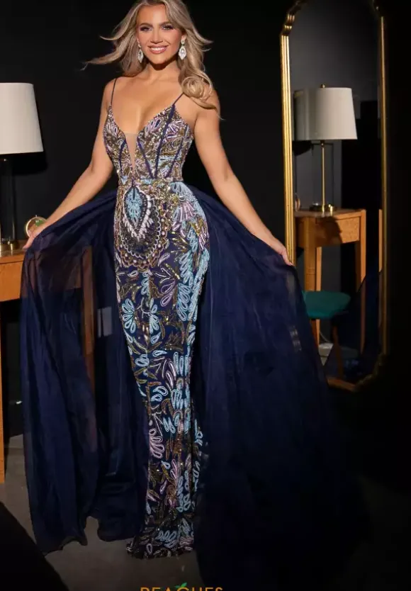 Steal the show in mesmerizing Rachel Allen jump suit style 70528, fully adorned in a vibrant mosaic of intricate beading patterns throughout. The bodice has an alluring deep plunge with a mesh covering, corset boning, and delicately slim straps that lead to an accentuating lace up back style. A dramatic and glamorous tulle overskirt flows beautifully with each step.