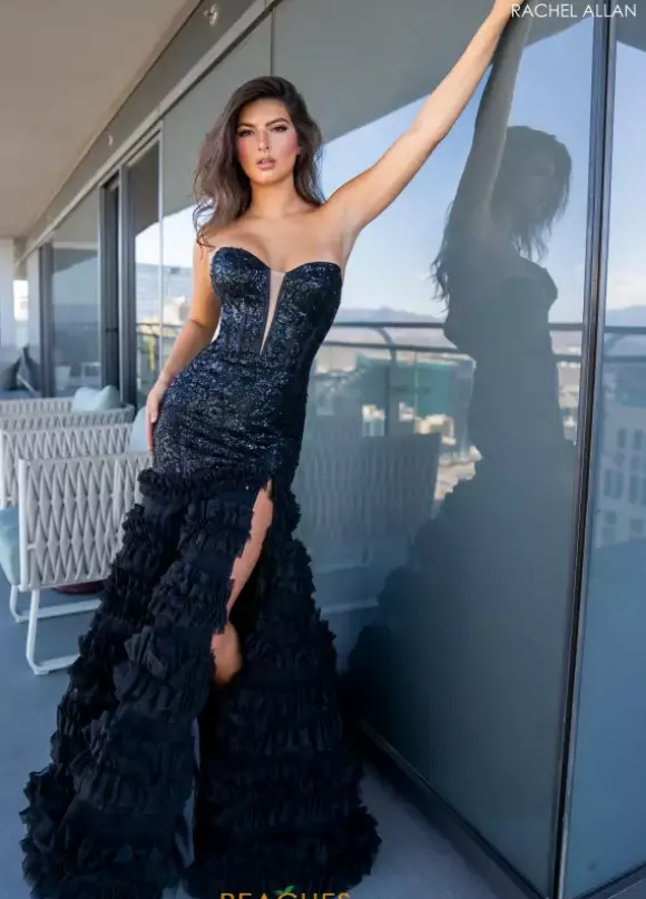 Make a grand entrance as you walk into your special event in this Rachel Allan long dress. This stunning mermaid silhouette 70543 showcases a lovely strapless neckline accompanied by a built in fitted corset bodice adorned with captivating beadwork. Flowing into a full multi layered ruffled tulle skirt this dress will have all eyes on you.