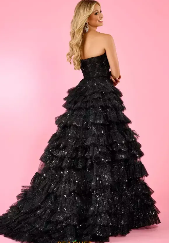Become a modern day princess when wearing this phenomenal a- line dress from Rachel Allan, style 70675. This number comes in three different colors: black, pink and purple. Showcasing a plunging sweetheart neckline with detachable off the shoulder cap sleeves leading to a back zipper closure. The top of this a- line dress is a corset, which will hug your body beautifully. It’s adorned with floral applique and dazzling beadwork. The bottom of the dress is made out of glitter tulle and has overlay material. For the perfect touch it has a pretty train.
