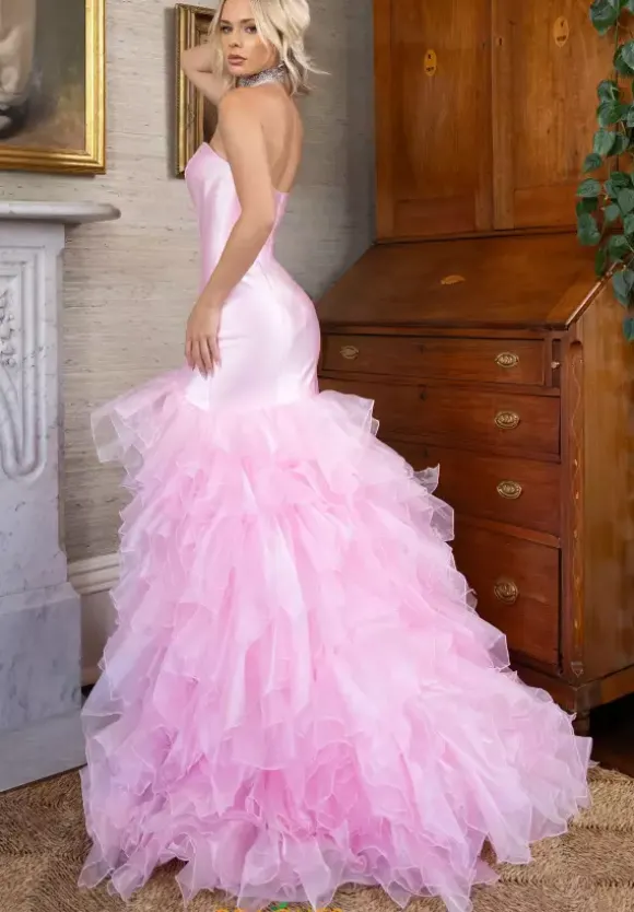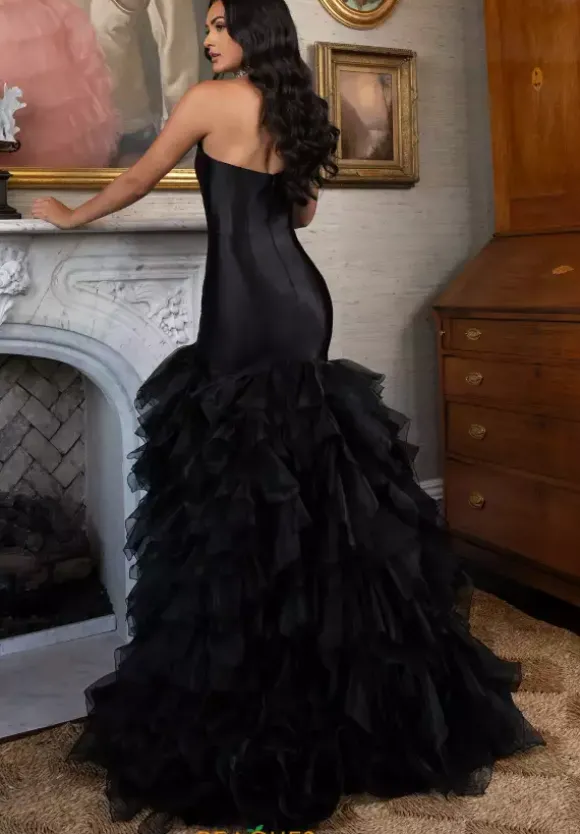 Sophistication exudes when you wear this absolutely gorgeous Rachel Allan long dress style 70938 to your next social occasion. This magnificent mermaid gown showcases a fitted long bodice made of stretch satin with a V neckline, beaded choker collar and low zipper closure back. The long mermaid skirt has organza tier ruffle layers with a front slit and back sweep train.