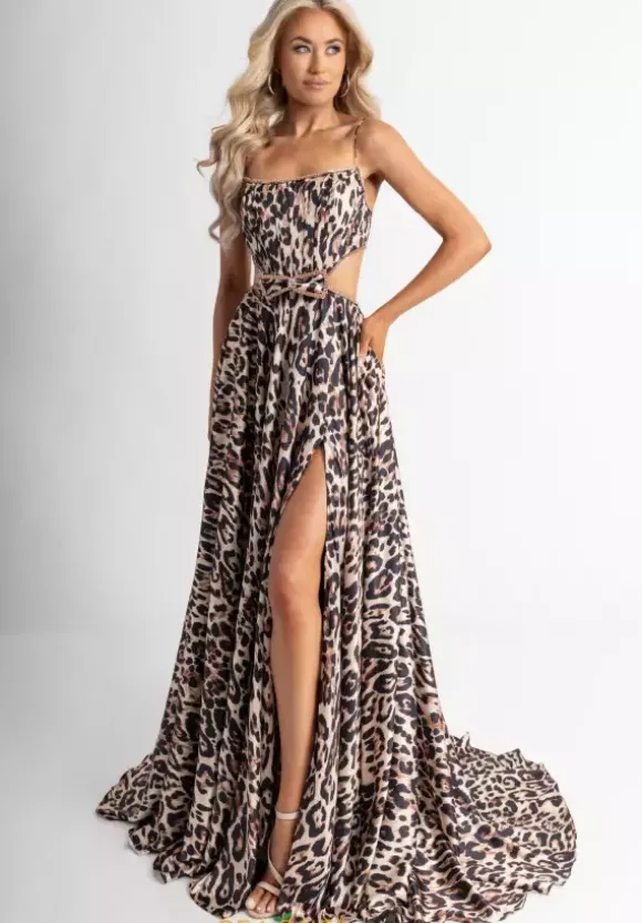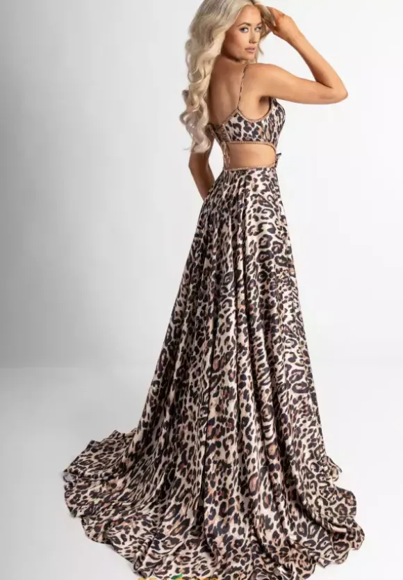 Embrace your inner diva and rock this totally fun Rachel Allan long dress style 70963 made in eye catching animal print satin fabric. This sensational gown features a fitted bodice trimmed with sparkling rhinestones with spaghetti straps, side cut outs and low open lace up tie back. The long, a line skirt has bow detailing at the waist, a front, side slit and back sweep train.