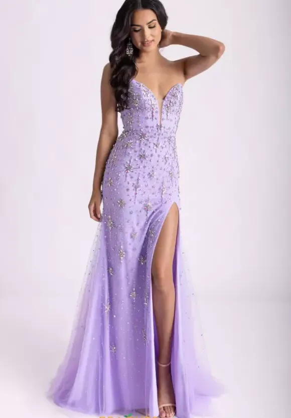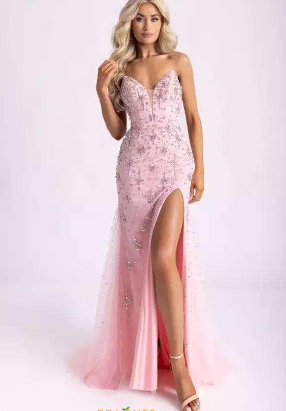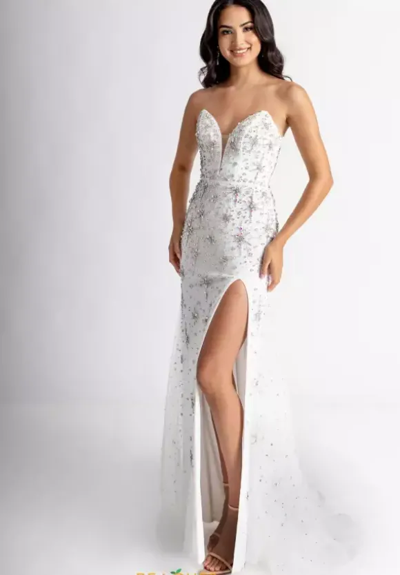 Sparkle beautifully all night long in this impeccable Rachel Allan long dress style 71013 embellished with a star burst pattern of crystals and beads. This scintillating gown features a strapless fitted bodice with a V neckline and lace up tie back. The long, stretch net skirt has a sexy front sit and small back sweep train.