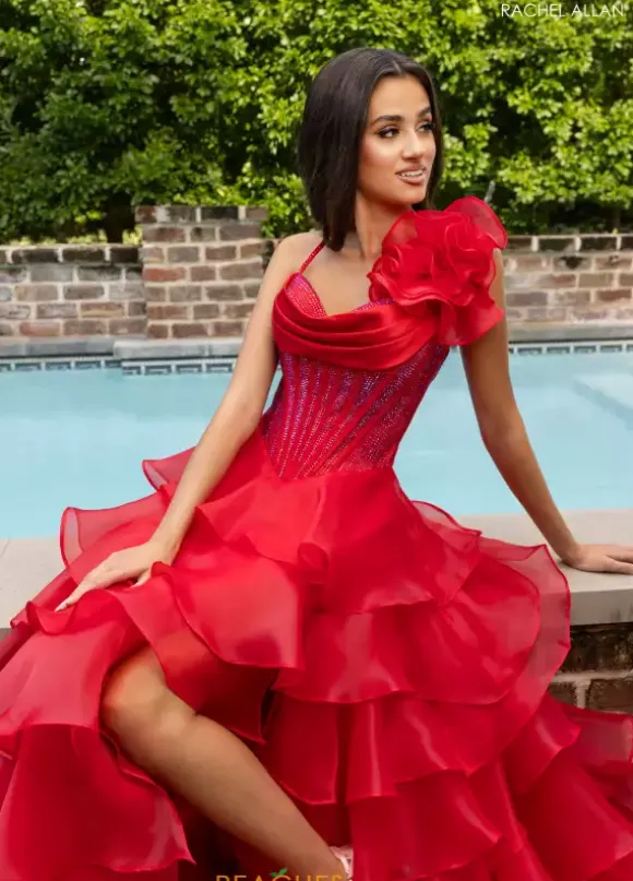 Look like you stepped out of a fashion show when you wear this alluring A line dress style 71049 designed by Rachel Allan. This zipper dress has a pleated scoop corset bodice dazzling with vivid rhinestones to sparkle radiantly with the frilly organza a-line skirt that cascades into the classic sweep train.