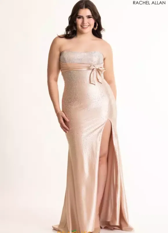 Show off your figure in this sleek fitted Rachel Allan long dress 71067. The strapless scoop neckline is met with an empire ruched belt with a bow. The dress is sparkling head to toe in hot set rhinestone beading and the skirt has a front thigh high slit and sweeping train. The stretch satin material hugs to your frame.