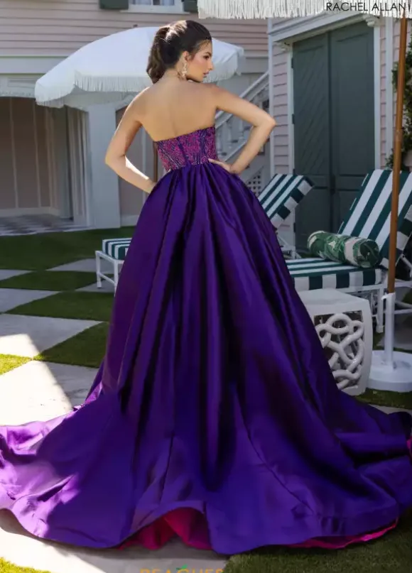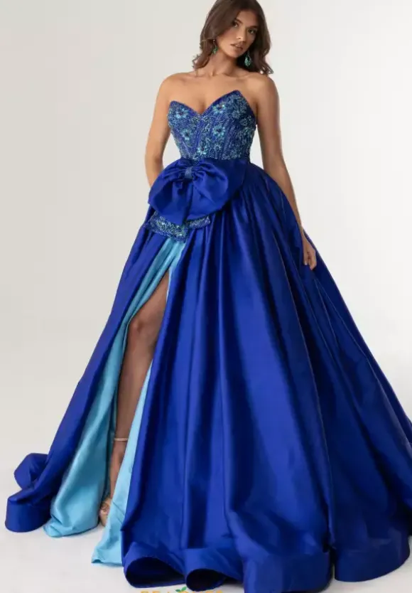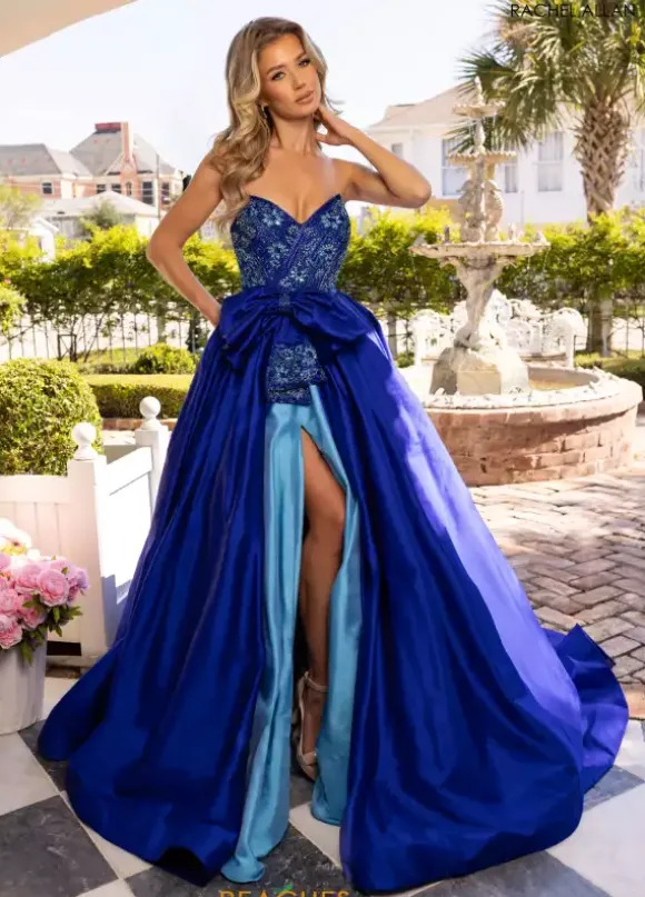 Experience an enchanting night in this stunning A line dress designed by Rachel Allan, style 71068. Showcasing a strapless V neckline and a beaded bodice with a one of a kind bow on the side. The a line skirt is made in luxurious taffeta material, giving you a timeless look. Complete this look with a stunning slit.