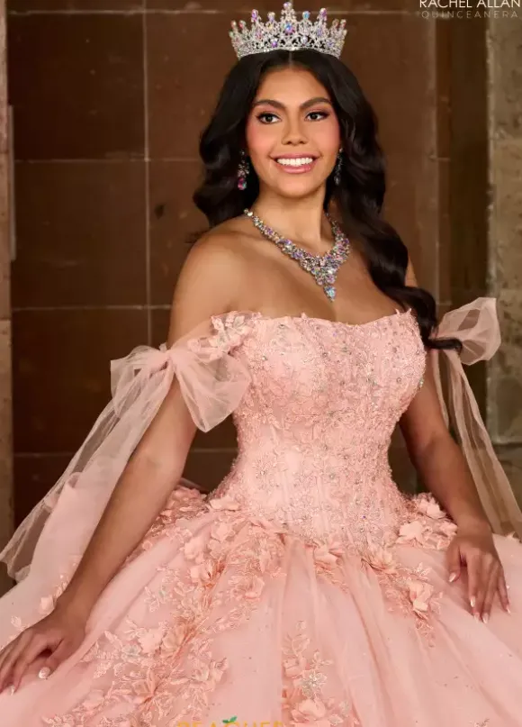 Have all jaws drop when you enter the room while wearing this enchanting long dress by Rachel Allan Quince, style RQ1132. Showcasing an off the shoulder scoop neckline. The corset bodice is adorned with gorgeous applique and gorgeous beadwork that cascade down the dress. A big fabulous bow adorns the back of the dress.