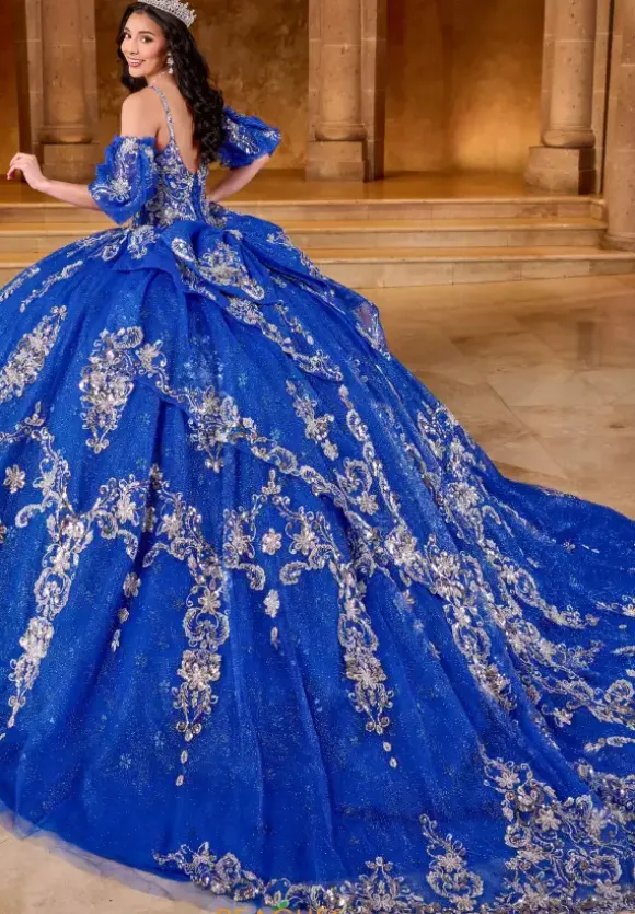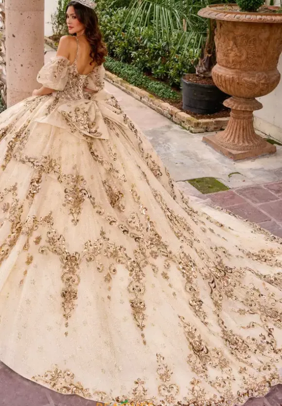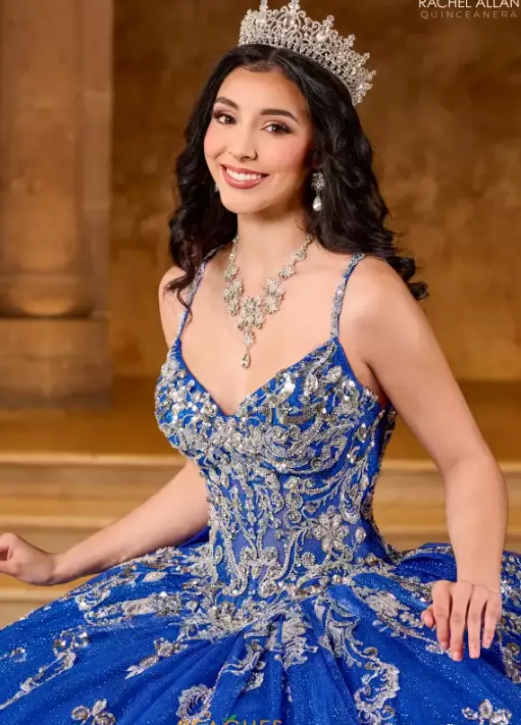 Feel like royalty in this stunning Rachel Allan Quince dress style RQ2202. This ball gown has a sunning long waisted bodice with a corset lace up in the back for a snug fit. A gorgeous bow decks the back of the ball gown with a long flowing train. Metallic appliques are scattered throughout the dress.