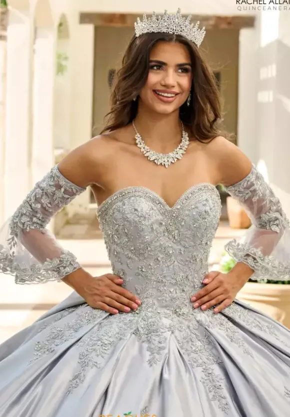 Captivate your audience when you wear this dress by Rachel Allan Quince style RQ2217. This ball gown dress features a strapless sweetheart neckline with off the shoulder detachable long sleeves. The quinceneara dress is decorated top to bottom with intricately placed appliques and beading revealing a stunning pattern. This satin dress features a detachable bow paired seamlessly with the train.