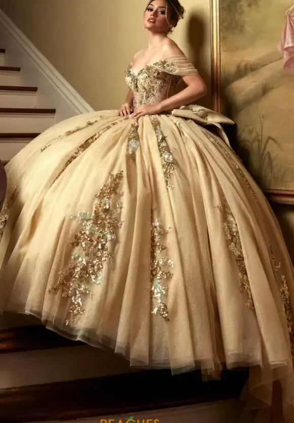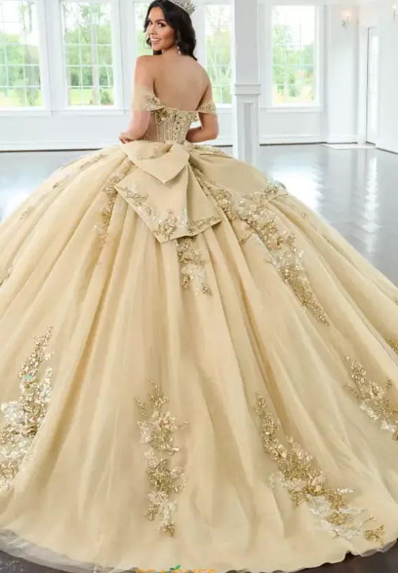 Feel like you just stepped out of a fairy tale in this stunning Rachel Allan Quince ball gown style RQ2224. This gorgeous bodice has a sweetheart neckline with off the shoulder cap sleeves and detachable shoulder straps. The bodice can be worn sheer but a detachable bodice liner is included. The ball gown skirt is perfectly full with a detachable bow in the back.