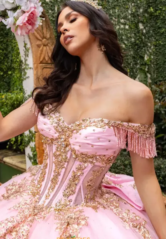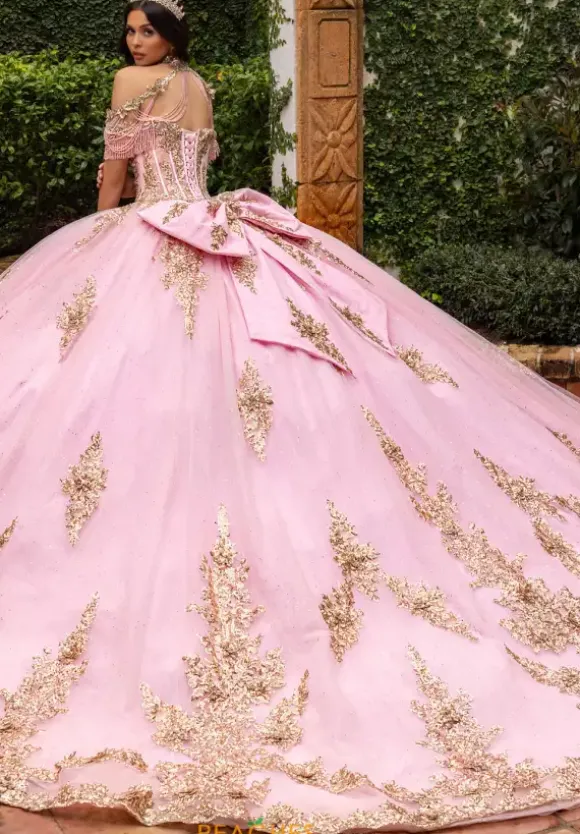 Live your princess fantasy in ball gown style RQ2225 by Rachel Allan Quinceanera. Featuring the delicate detachable off the shoulder cap sleeves adorned with lovely beading and fringe along the trim to compliment the fully beaded illusion bodice. Showcasing the captivating tulle skirt is embellished with intricate applique placed along the small of the waist and along the trim of the bottom and finishing along the beautiful train. Necklace sold separately as style QS2225.