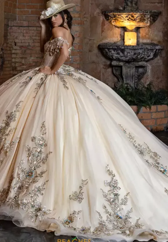 Make a grand entrance in this timeless ball gown by Rachel Allan Quince, style RQ2228. Showcasing a stunning sweetheart neckline with stylish off the shoulder cap sleeves that is adorned with dainty fringes. The detachable bodice liner let’s you create different looks as you desire. With its mesmerizing applique and lovely dreading, this dress’s train is sure to grab everyone’s attention.