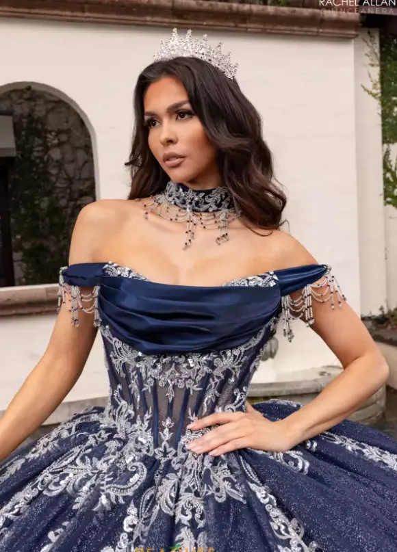 Wear this charming Rachel Allan Quince style RQ2230 for your special event. This amazing full ballgown showcases a modest scoop neckline paired with off the shoulder cap sleeves that feature draping fringe. Unique lace applique and dazzling beadwork covers this stylish number ensuring you stand out effortlessly.