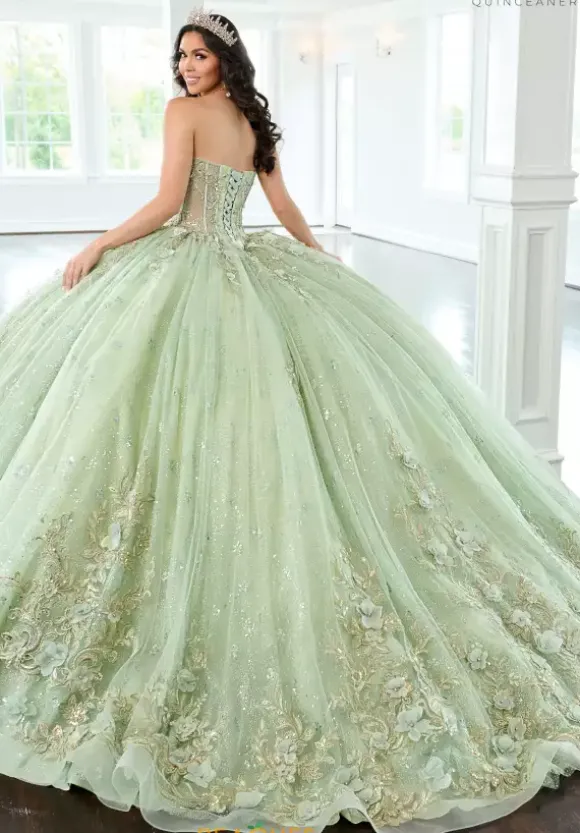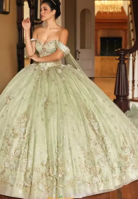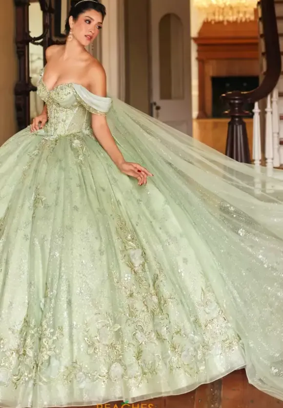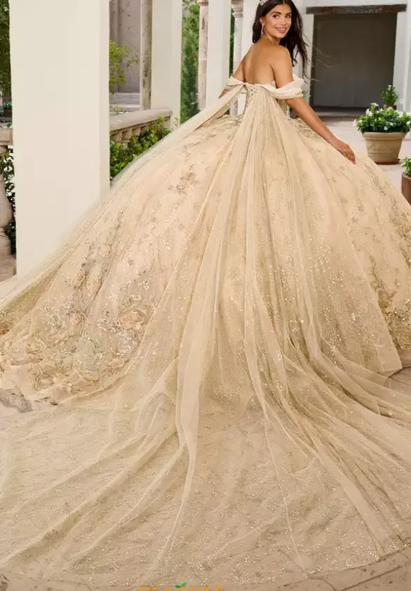 Mesmerize anyone you come in contact with when you wear this dress by Rachel Allan Quince style RQ3146. This ball gown dress features a strapless sweetheart neckline paired with detachable cap sleeves with streamers that flow to the skirt. The bodice features a corset with a detachable bodice liner and a lace up in the back. This dress displays magnificent decoration with appliques, beading, organza and glitter tulle that seamlessly flows with the gorgeous train.